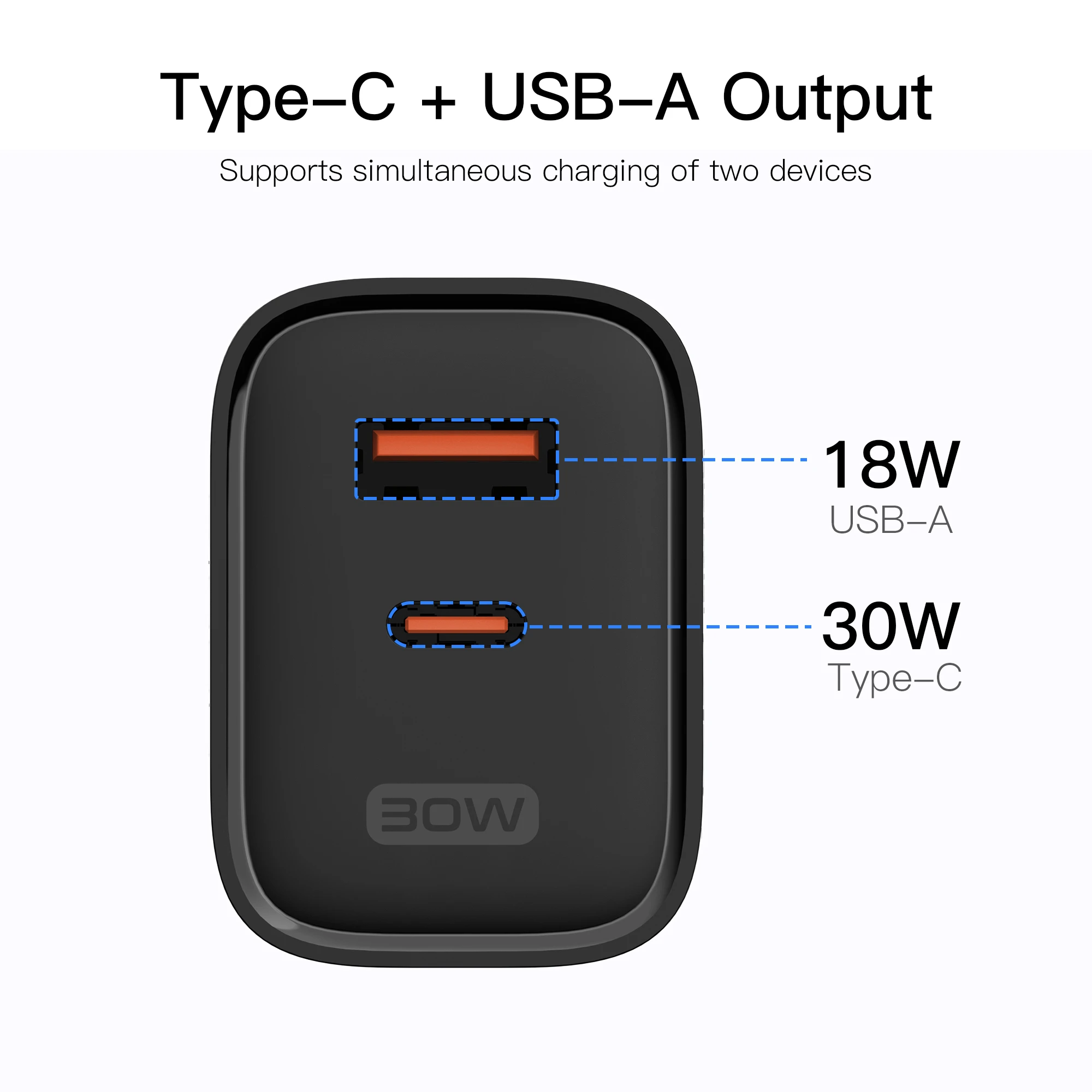 Type C & USB-A dapat mengisi perangkat sekaligus dengan pengisian cepat up to 30W.