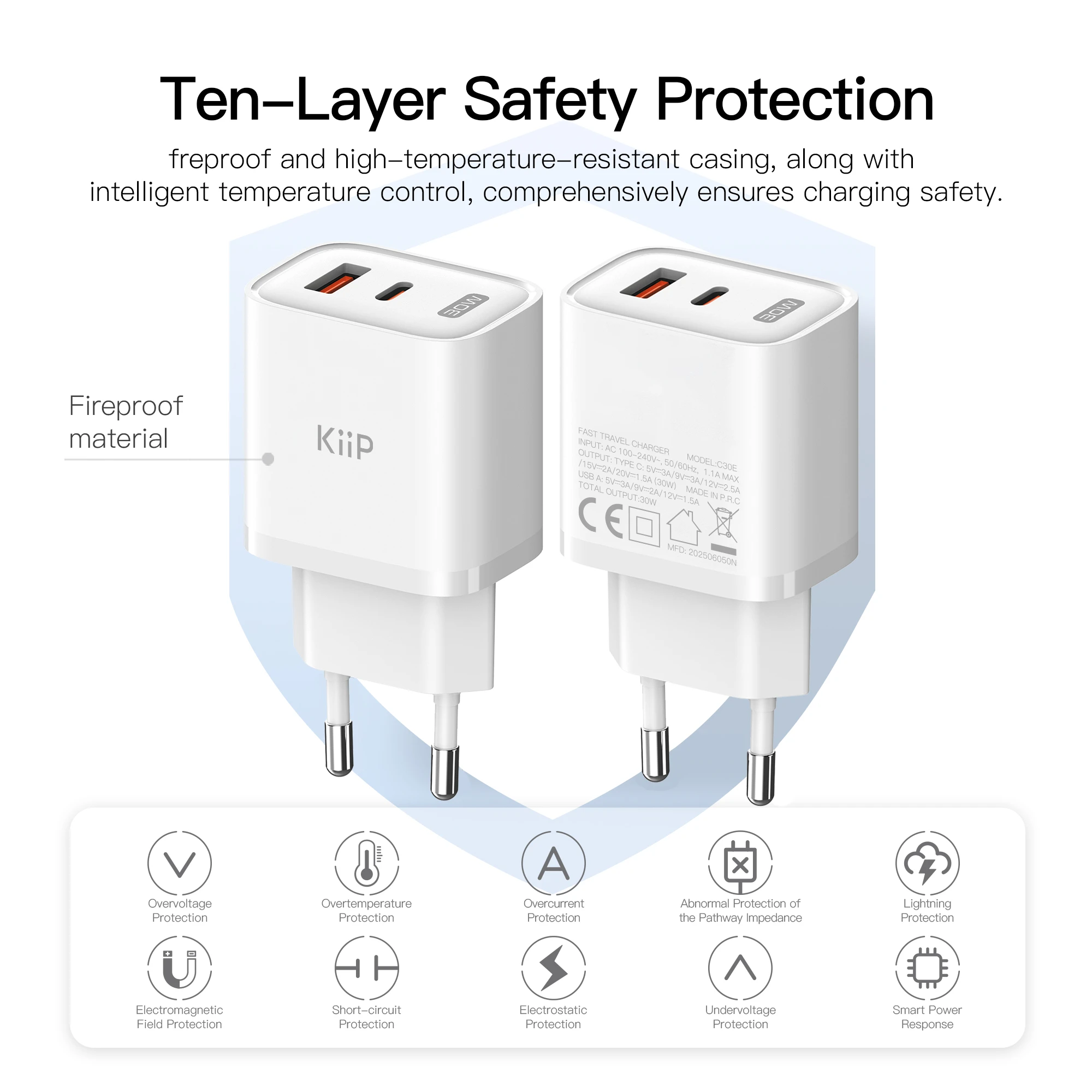 Support proteksi universal seperti; Over voltage protection, Over temperature Protection, Overcurrent Protection, Abnormal Protection, Lightning Protection, Electromagnetic Field Protection, Short Circuit Protection, Electrostatic Protection, Undervoltage Protection, & Smart Power Response, yang memberikan keamanan extra pada Adaptor dan Smartphone