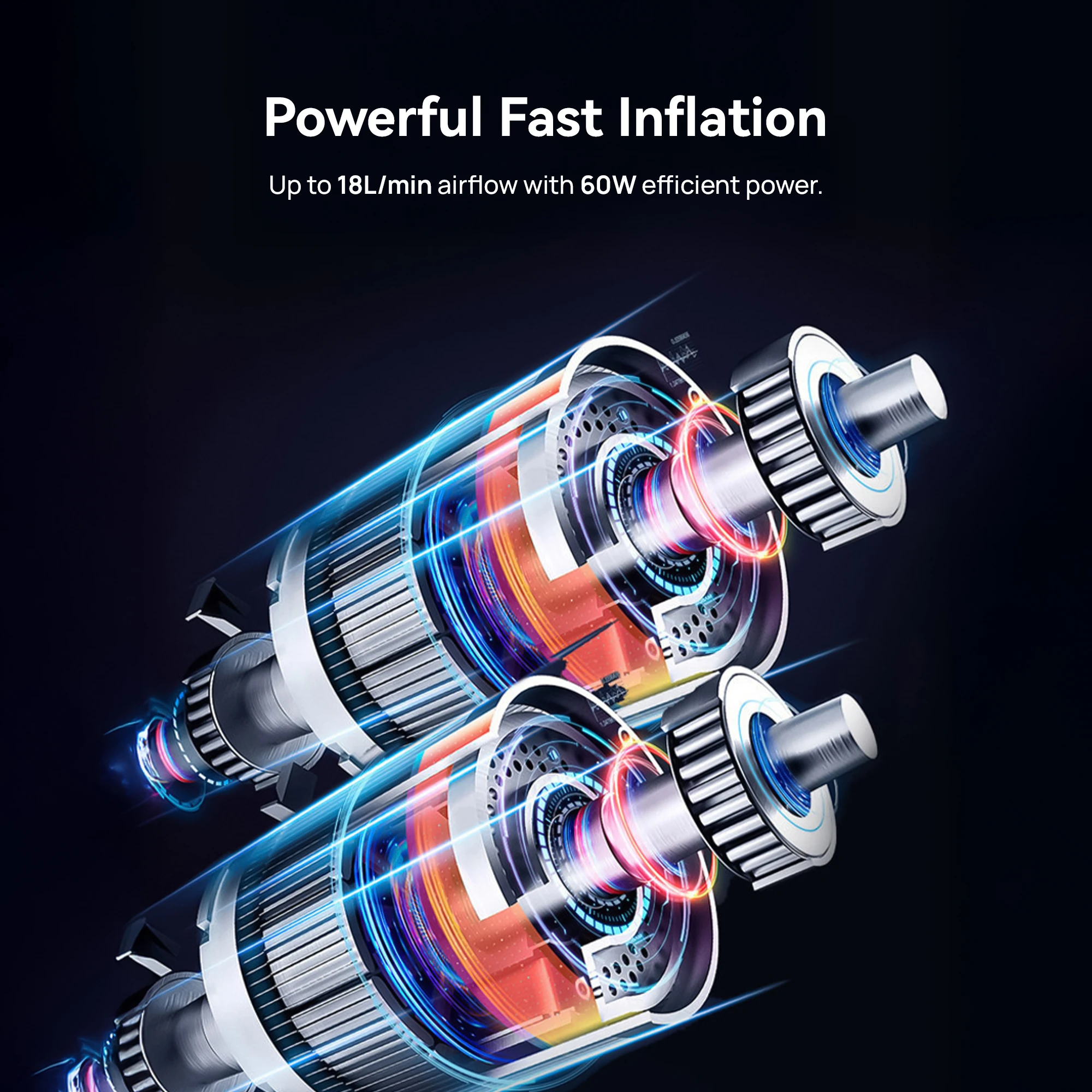 Ditenagai motor dengan daya 60W, laju aliran udara mencapai 18L/menit, mengisi angin menjadi lebih efisien dan hemat waktu dibandingkan pompa portabel standar lainnya.