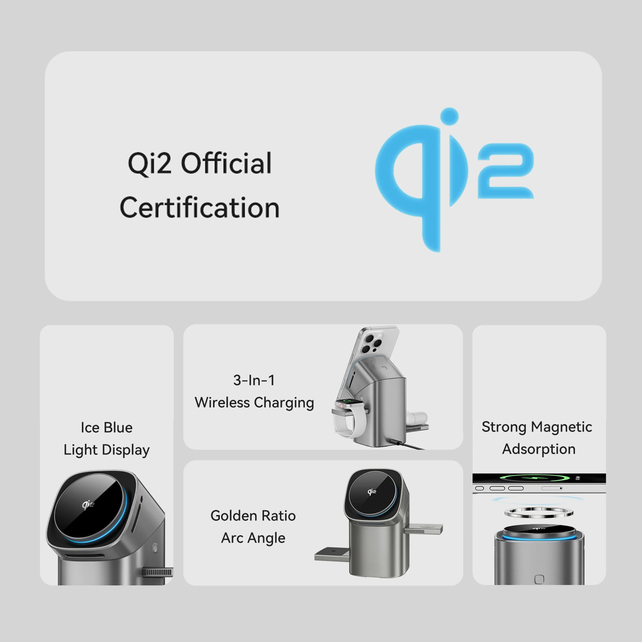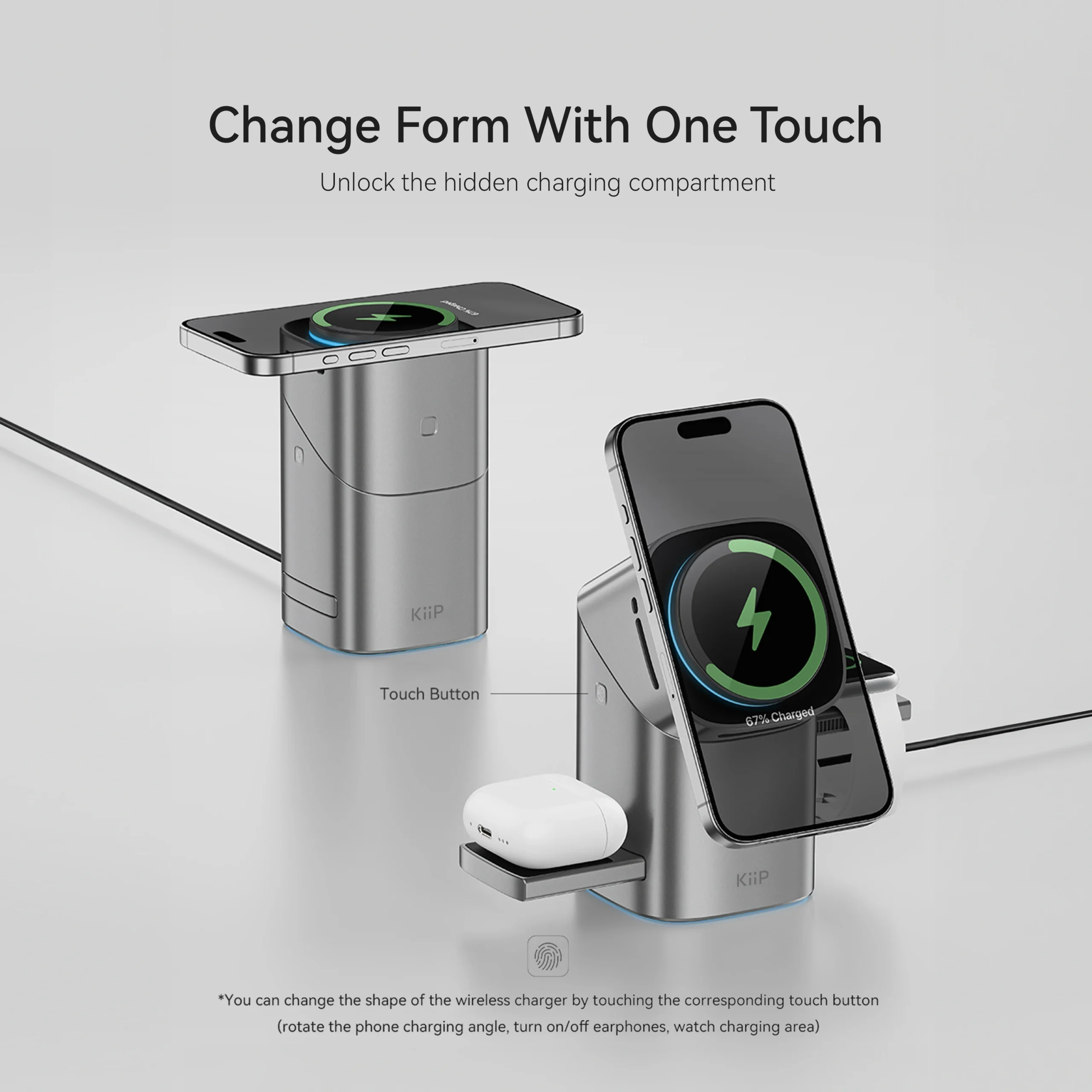 KiiP T2 Pro adalah perangkat pengisi daya nirkabel serbaguna dengan desain modern dan kompak, yang mampu mengisi daya tiga perangkat sekaligus smartphone, smartwatch, dan earbuds secara nirkabel dan bersamaan. Menggunakan teknologi Qi2 terbaru, perangkat ini mendukung pengisian cepat hingga 15W untuk ponsel yang kompatibel. Fitur Utama: