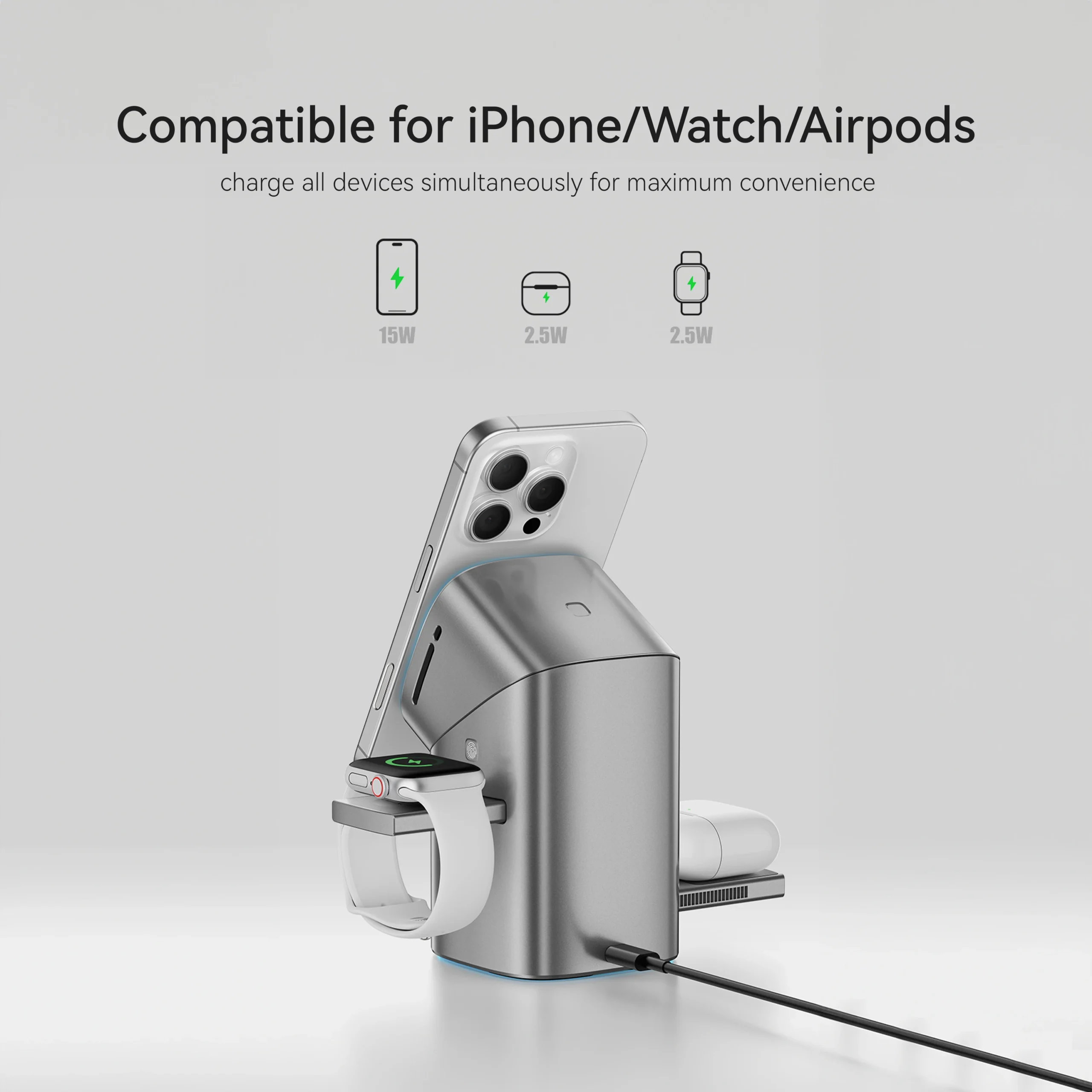 * 3-in-1 Charging Station: Bisa mengisi daya smartphone, jam tangan pintar, dan headset wireless secara bersamaan.